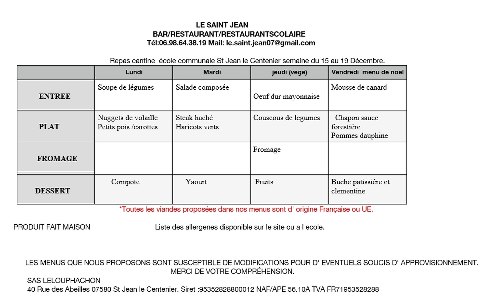 voici les menus proposés par le Restaurant le Saint Jean pour les enfants déjeunant à la cantine.