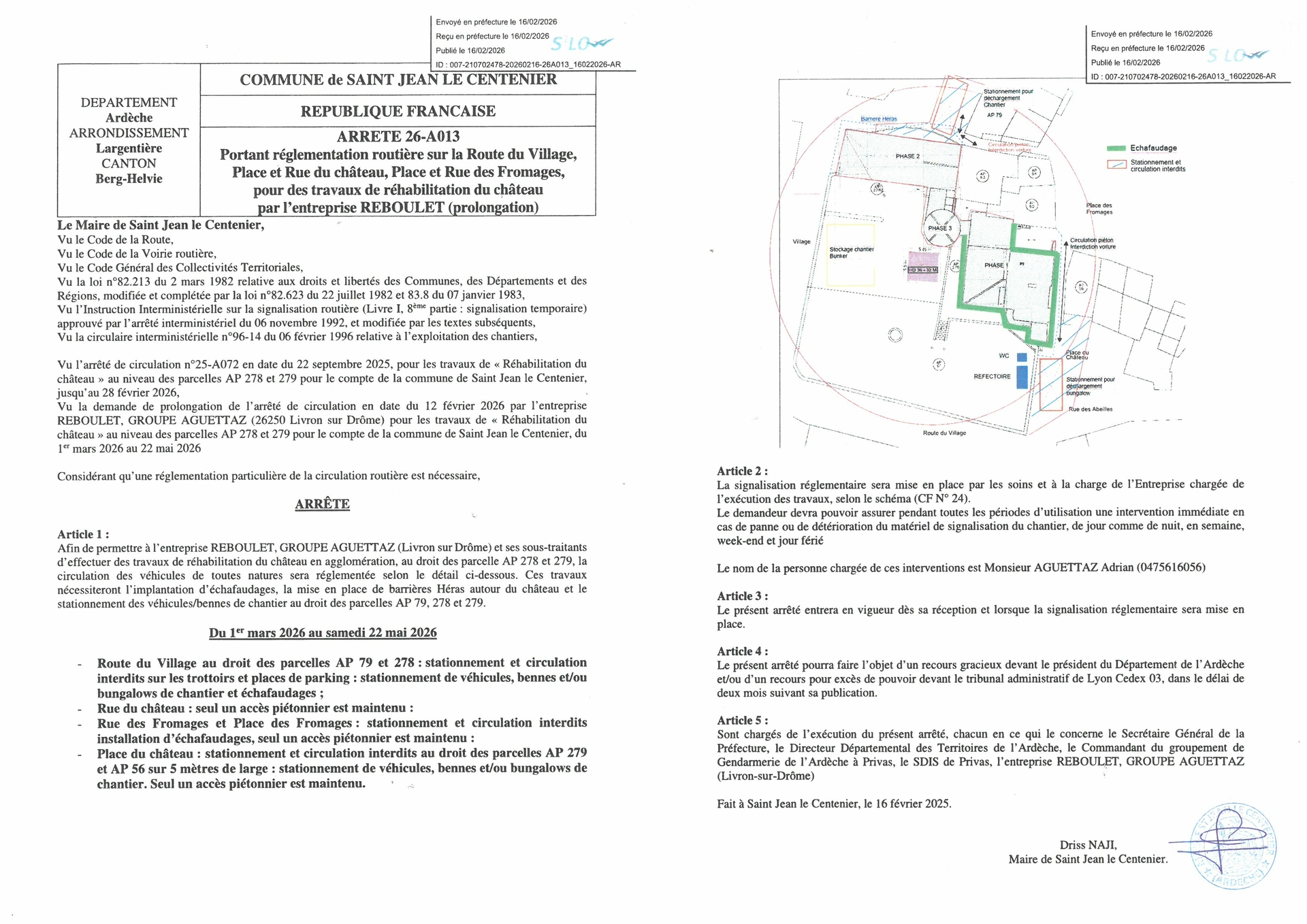 Afin de permettre à l’entreprise REBOULET, GROUPE AGUETTAZ (Livron sur Drôme) et ses sous-traitants d’effectuer des travaux de réhabilitation du château en agglomération, au droit des parcelle AP 278 et 279, la circulation des véhicules de toutes natures sera réglementée selon le détail ci-dessous. Ces travaux nécessiteront l’implantation d’échafaudages, la mise en place de barrières Héras autour du château et le stationnement des véhicules/bennes de chantier au droit des parcelles AP 79, 278 et 279.